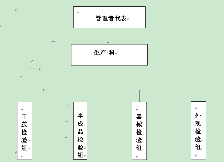 本公司確立以管理者代表負責的質(zhì)量管理組織,設(shè)立符合產(chǎn)品質(zhì)量要求的管理部門,由生產(chǎn)科全面負責公司的產(chǎn)品質(zhì)量。下設(shè)四個組,即干繭檢驗組、半成品檢查組、器械檢驗組、外觀檢驗組。